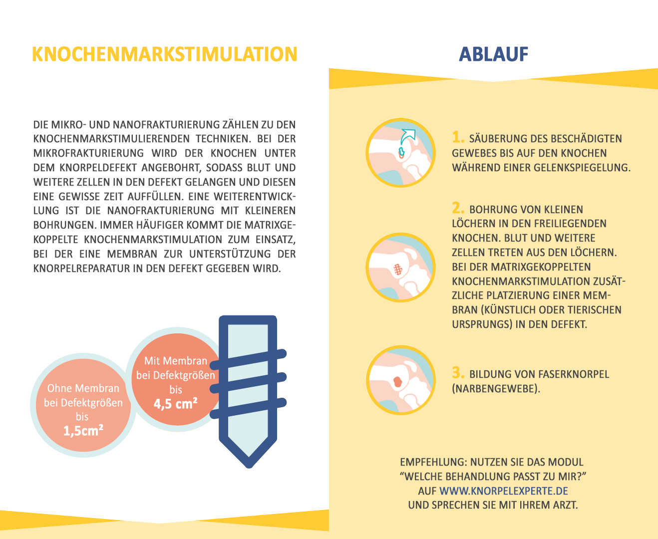 Zu den knochenmarkstimulierenden Techniken zählen die Mikro- und Nanofrakturierung. Bei der Mikrofrakturierung werden kleine Öffnungen in den Knochen unter dem Knorpeldefekt gebohrt. Blut und weitere Zellen gelangen in den Defekt und füllen diesen eine gewisse Zeit auf. Eine Weiterentwicklung ist die Nanofrakturierung mit noch kleineren Bohrungen. Immer häufiger kommt auch die matrixgekoppelte Knochenmarkstimulation zum Einsatz, bei der eine Membran zur Unterstützung der Knorpelreparatur in den Defekt gegeben wird.