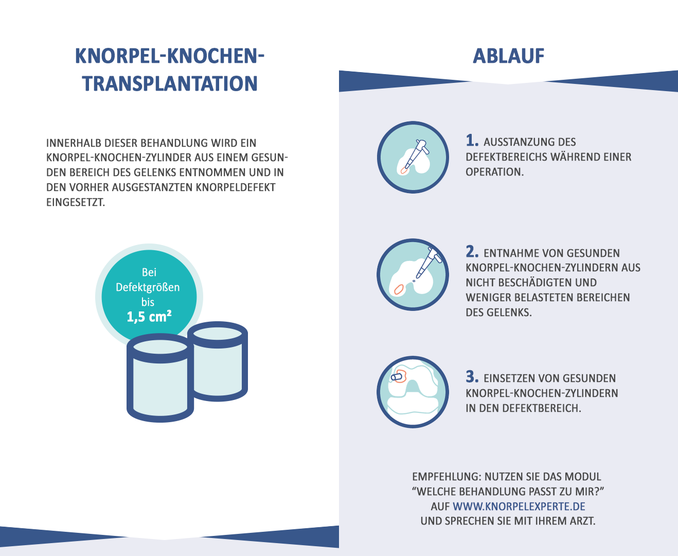 Innerhalb dieser Behandlung wird zuerst der betroffene Defektbereich während einer Operation ausgestanzt. Anschließend werden gesunde Knorpel-Knochen-Zylinder aus nicht beschädigten Bereichen des Gelenks entnommen. Diese werden dann in den vorher ausgestanzten Knorpeldefekt eingesetzt.