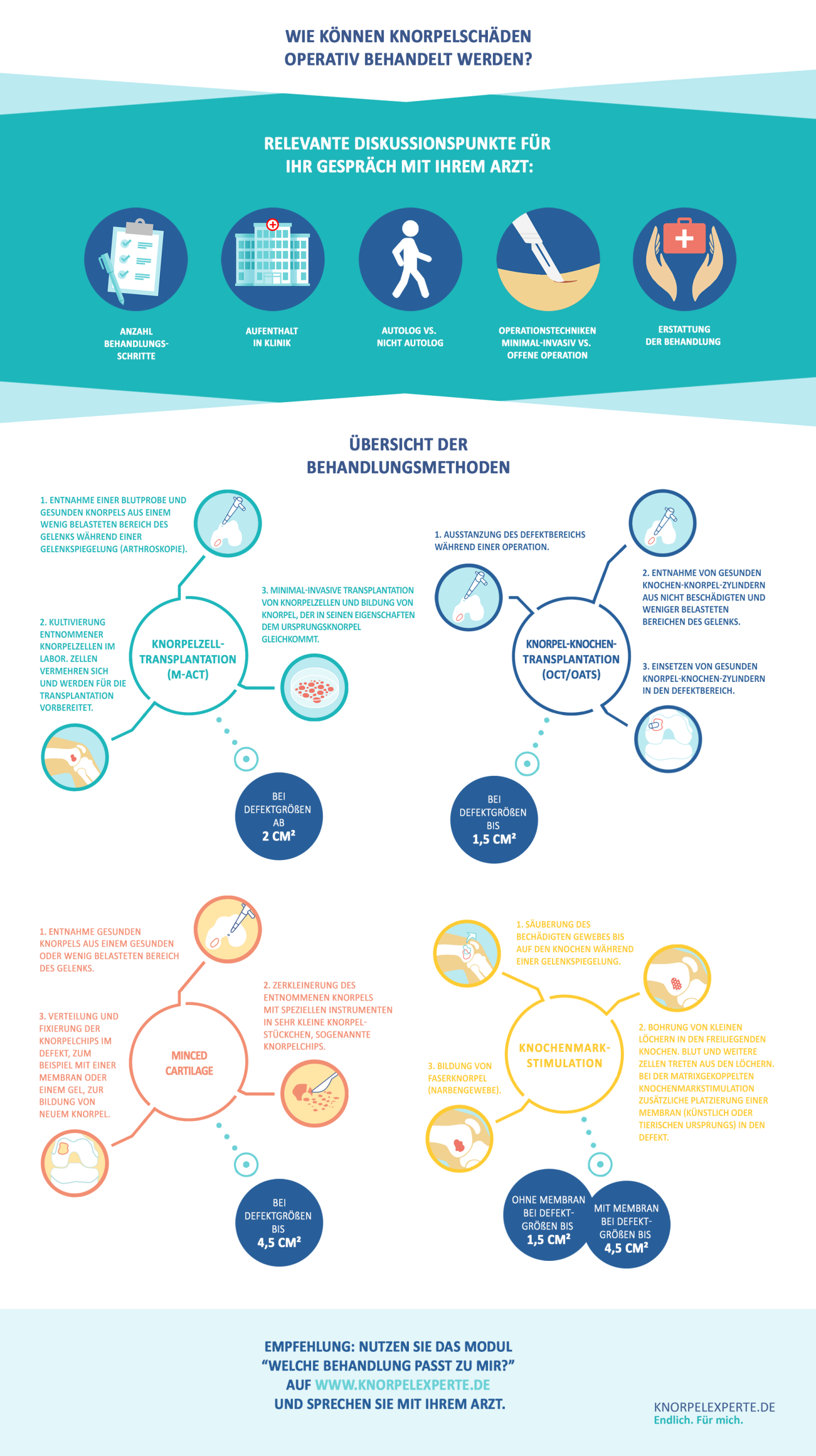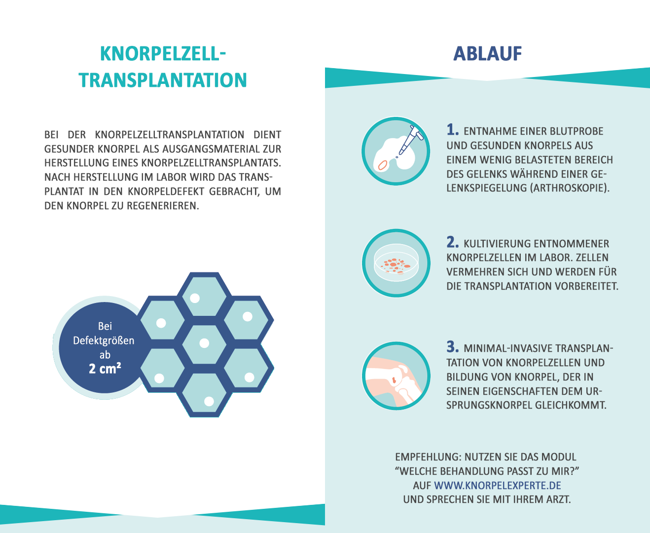 Anschließend werden die Knorpelzellen mit Hilfe einer zweiten minimal-invasiven Operation in den gesäuberten Knorpeldefekt transplantiert. Die Knorpelzellen heften sich entweder selbständig oder mit Hilfe einer Matrix an und formen neuen, hyalin-ähnlichen Knorpel. Die Behandlung kann bei Defektgrößen ab 2 cm2 eingesetzt werden und ist damit für Patienten mit kleineren und größeren Defekten geeignet.