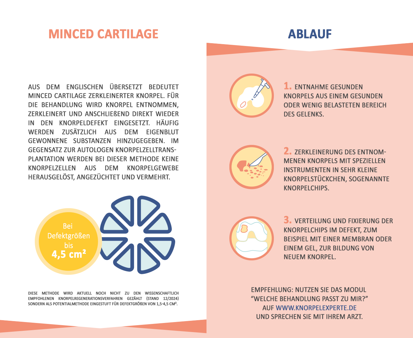 Aus dem Englischen übersetzt bedeutet Minced Cartilage zerkleinerter Knorpel. Innerhalb der Behandlung wird gesunder Knorpel während einer Operation entnommen, zerkleinert und anschließend direkt wieder in den Knorpeldefekt eingesetzt. Häufig werden aus dem Eigenblut gewonnene Substanzen hinzugegeben.