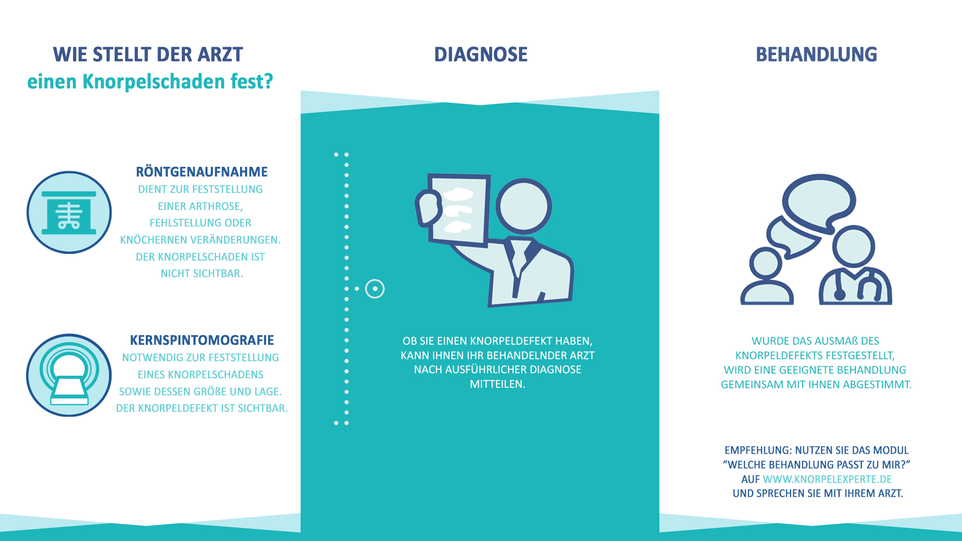 Um einen Knorpeldefekt sicher festzustellen, werden verschiedene bildgebende Verfahren angewandt. Dazu gehören Röntgenaufnahmen, die aufzeigen, ob eine Arthrose, Fehlstellungen oder knöcherne Veränderungen vorliegen sowie ein MRT, um den Knorpelschaden selbst und die Lokalisation und Größe zu bestimmen. Ist das Ausmaß des Knorpelschadens in der Knorpelschicht festgestellt, wird der Arzt die geeignete Behandlung mit Ihnen abstimmen.